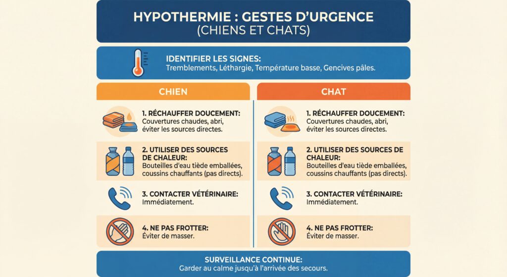 Agissez rapidement mais avec méthode : réchauffement progressif, pas de chaleur directe, et contact immédiat avec un vétérinaire d’urgence. Chaque minute compte dans ces situations critiques.